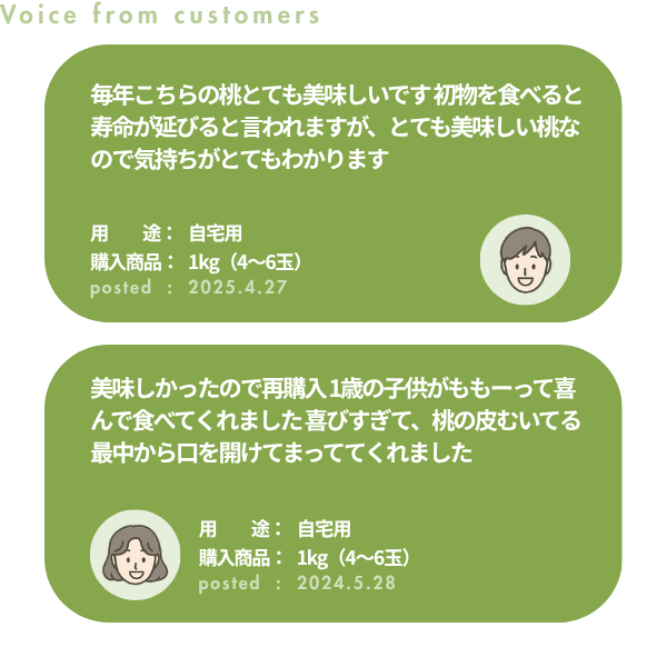 JAフルーツ山梨公式オンラインショップをご利用いただき、ありがとうございます。 再度のご購入、誠にありがとうございます。 生産者が丹精込めて作ったハウスももをお気に召していただけ、光栄でございます。 また、お口を開けて待っているお子様のお姿を想像し、とても嬉しい気持ちでいっぱいです。 これからもお客様にご満足いただける高品質な商品づくりに励んでまいります。 改めまして、当店をご利用いただきまして、誠にありがとうございました。 またのご利用をスタッフ一同、心よりお待ちしております。