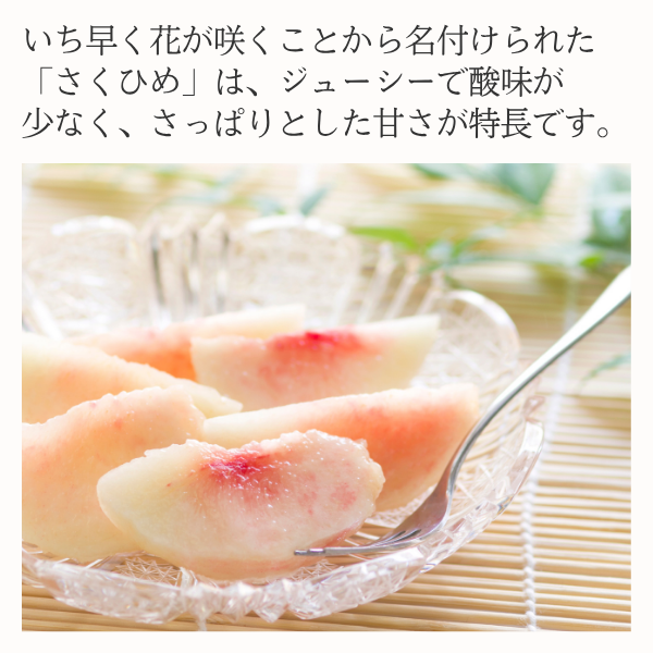 JAフルーツ山梨公式オンラインショップをご利用いただき、誠にありがとうございます。 大切なプレゼントに「さくひめ【ハウスもも】」をお選びいただき、美味しく召し上がっていただけて、スタッフ一同大変光栄でございます。 「さくひめ【ハウスもも】」は気候変動により冬の気温が高くても安定した生産ができ、さっぱりとした甘さが特徴です。 またのご利用をスタッフ一同、心よりお待ちしております。 改めまして、当店をご利用いただきまして、誠にありがとうございました。