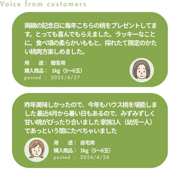 両親の記念日に毎年こちらの桃をプレゼントしてます とっても喜んでもらえました ラッキーなことに、食べ頃の柔らかいももと、採れたて限定のかたい桃 両方楽しめました あっという間に食べちゃたそうです 一緒に食べた2歳の幼児も桃♪って喜んでくれました